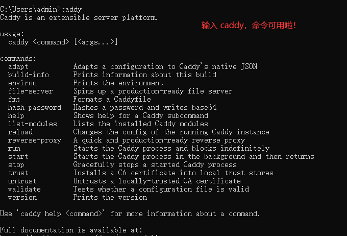 最后,我们点击 确定,保存设置。我们在命令行中输入 caddy,安装成功啦!(见下图)