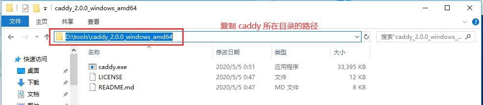 下载完成后,解压到你的常用目录(路径最好别带中文),然后我们复制 Caddy 所在目录的路径(见下图)