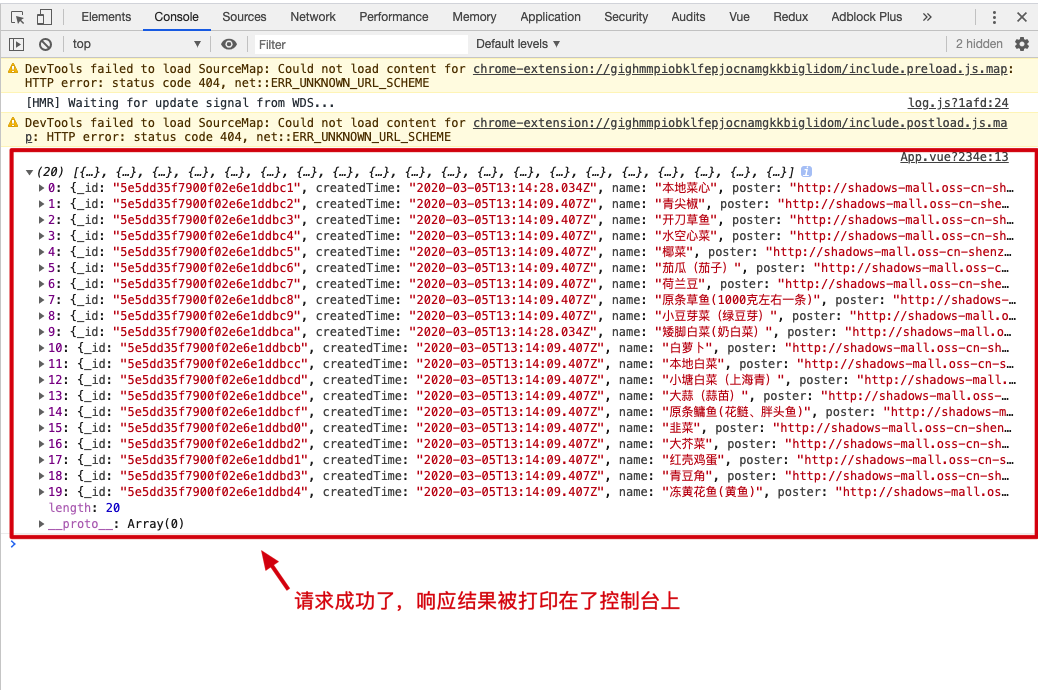 然后我们打开浏览器,打开 :3000(Demo 的运行地址),查看控制台输出的请求结果(见下图)