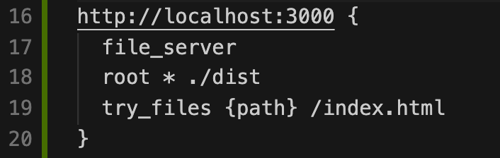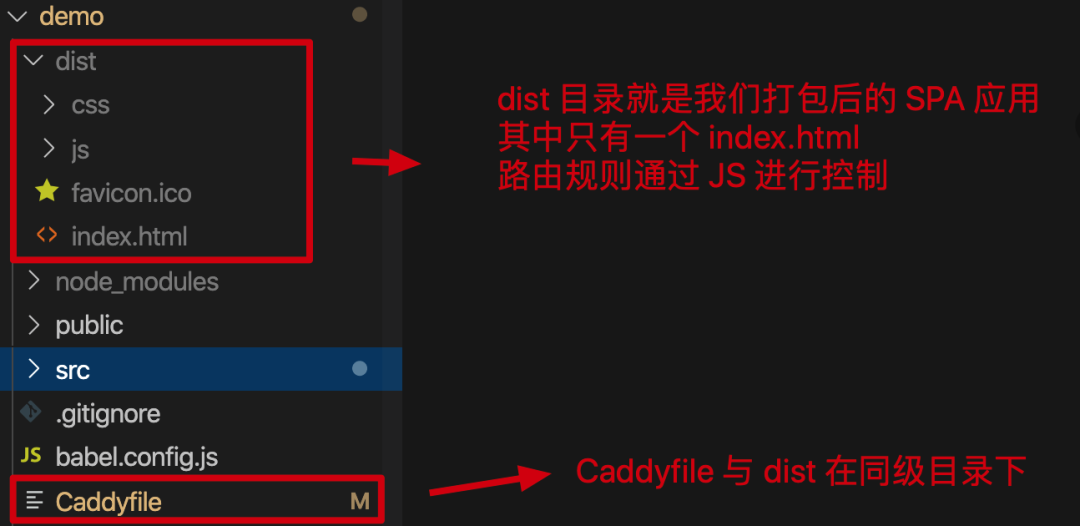 我们构建好的代码在 dist 目录下,Caddyfile 与 dist 同级,接下来我们配置一下 Caddyfile,配置如下: