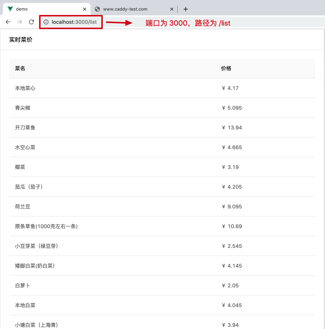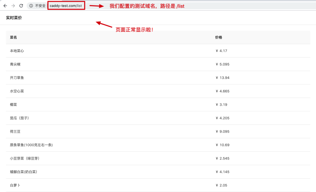 ❞这条记录表示,当匹配到 www.caddy-test.com 域名时,返回 IP 地址 127.0.0.1(本机 IP)。我们在配置好了 hosts 文件后,我们再次打开 /list(如下图)