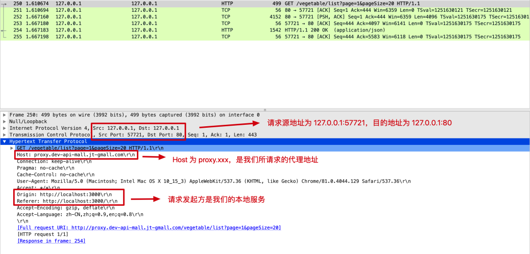 从上面可以看出,我们的请求源是 127.0.0.1:57721(IP 地址为我们本机的 IP,端口为 浏览器 发起请求时使用的的随机端口 - 浏览器 客户端),目的地址是 127.0.0.1:80(IP 地址为我们本机的 IP,端口为 Caddy 的运行端口 - Caddy 服务端)。我们的 Host 请求头为 proxy.dev-api...(代理地址),请求来源(发起方)是 :3000(我们的本地服务)。