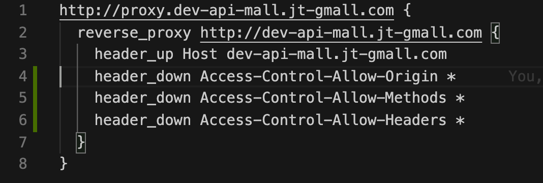 第 1 行:拦截对 这条 url 的访问请求,进行内部逻辑处理;第 2 行:将 拦截的请求 转发(反向代理)到 (我们的目标地址);第 3 行:在转发请求时,添加首部字段 Host: dev-api-mall.jt-mall.com,这一步的目的是为了让目标服务器能够识别请求源;第 4~6 行:在响应结果时,添加 Access-Control-Allow-*: * 等多个首部字段信息,这样可以通过浏览器的 同源策略 检测;我们通过嵌套结构的几行代码就可以将 Caddyfile 配置完成啦!