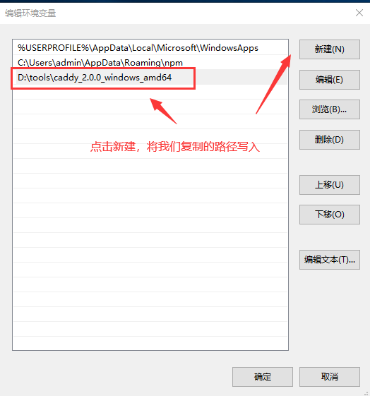 然后,我们在弹出的窗口中点击新建,将我们复制的 Caddy 目录路径粘贴进去(见下图)