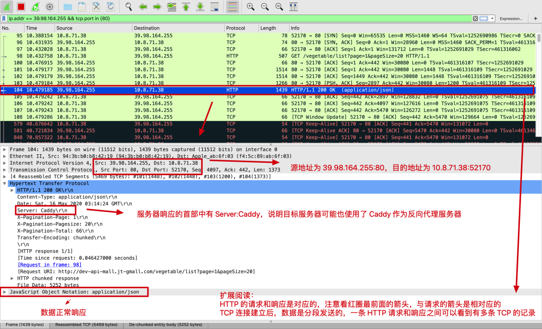 我们从上图可以看出,这条响应结果的源地址是 39.98.164.255:80(IP 地址为请求的服务器 IP,端口为请求的服务器端口 80 - 远程服务器),目的地址是 10.8.71.38:52170(IP 地址为我们本机的 IP,端口是 Caddy 使用的随机端口 - Caddy 客户端)。服务器将响应结果发送到 Caddy 客户端,我们的 Caddy 客户端接收到响应结果后,由 Caddy 服务器进行处理。