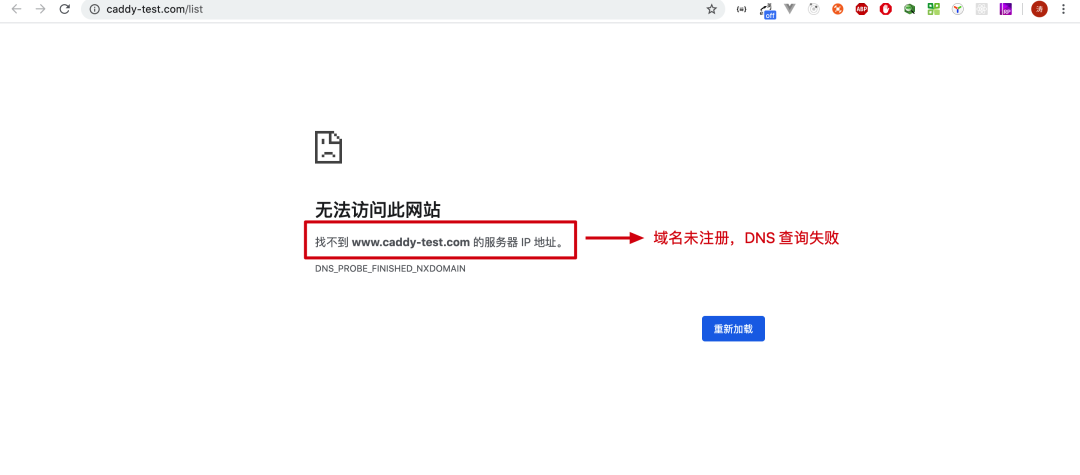 从上图可以看出,由于这个域名尚未注册,所以导致我们的 DNS 查询失败啦!