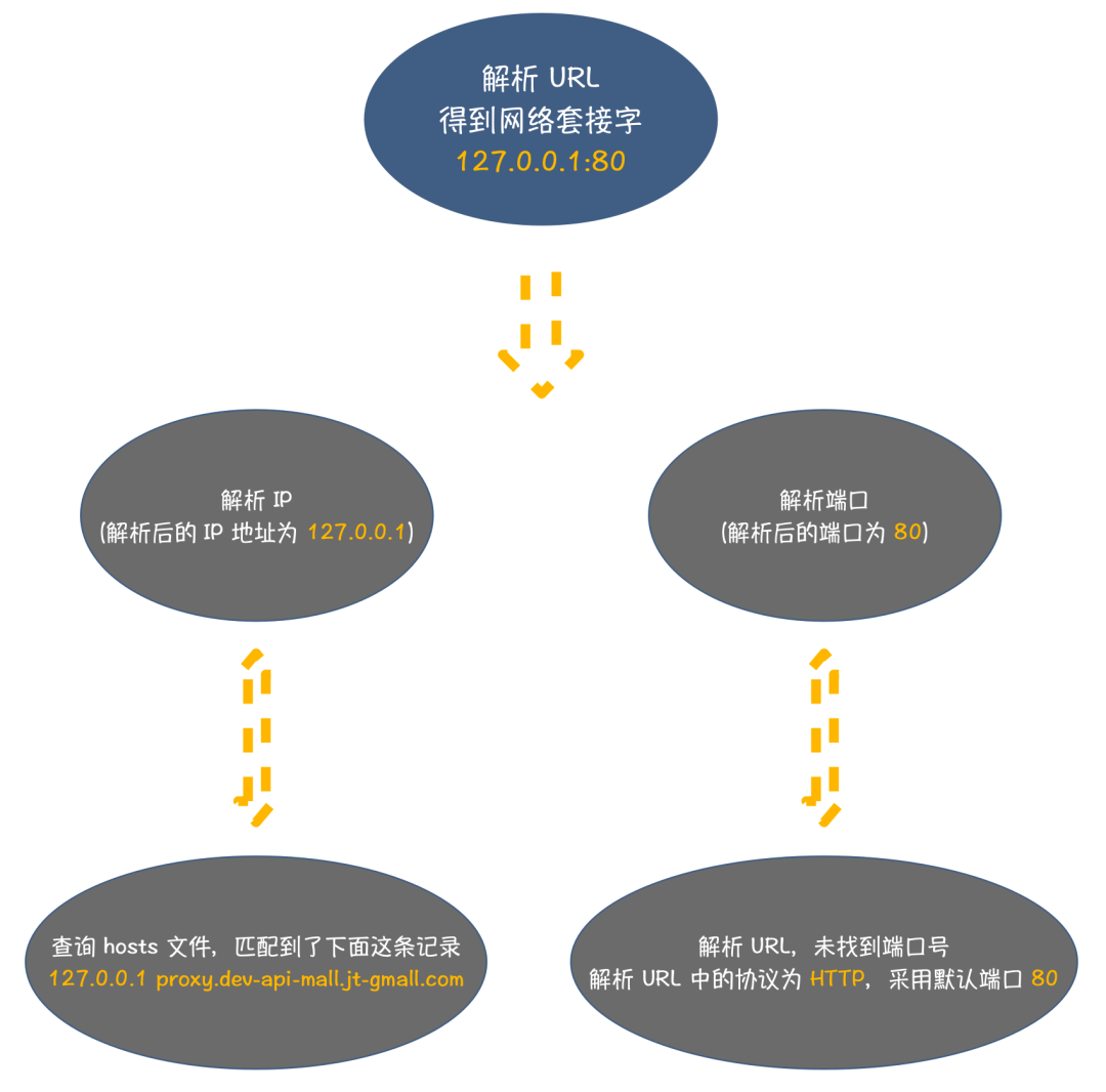 在解析出了 hostname 后,浏览器读取主机的 hosts 文件配置,查询是否匹配,此时将命中我们在 hosts 文件中设置的 127.0.0.1 proxy.dev-api-mall.jt-gmall.com 规则,将域名解析为 IP 地址 - 127.0.0.1,也就是本机地址。