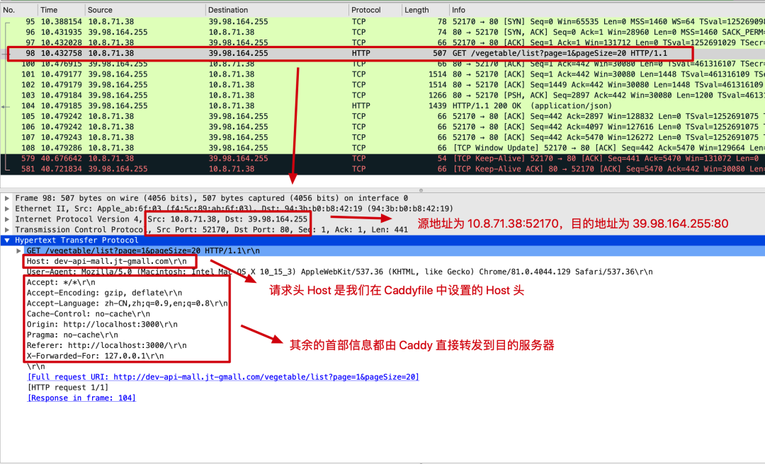 从上图可以看出,这条请求由作为客户端的 Caddy 发出。我们的请求源是 10.8.71.38:52170(IP 地址为本机的 IP,端口是 Caddy 使用的随机端口 - Caddy 客户端),目的地址是 39.98.164.255:80(IP 地址为目标服务器 IP,端口为 HTTP 协议默认端口号 - 目标服务器)。我们的 Host 请求头为 dev-api...(我们在 Caddyfile 中指定的 Host 首部),其余的首部字段及请求信息都由 Caddy 直接转发到目标服务器。