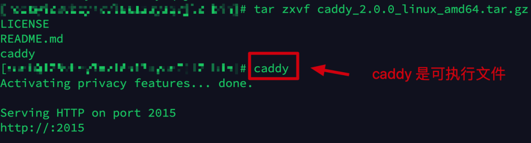 ❞我们使用 tar zxvf caddy_2.0.0_linux_amd64.tar.gz 解压文件,解压后的 caddy 文件是可执行文件,我们再配置相应的映射,将命令映射到全局即可(见下图)