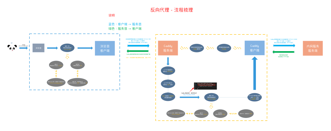我们从客户-服务端的视角来进行解析,我们的浏览器就是客户端,Caddy 同时作为服务端与客户端,目标服务器属于服务端。