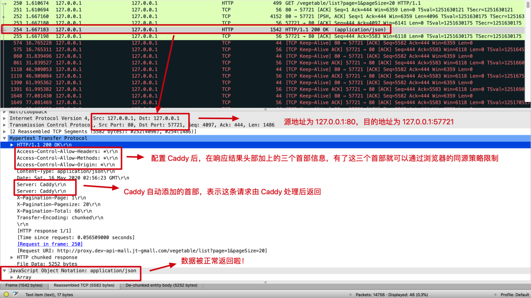 我们从上图可以看出,这条响应结果的源地址是 127.0.0.1:80(IP 地址为我们本机的 IP,端口为 Caddy 的运行端口 - Caddy 服务端),目的地址是 127.0.0.1:57721(IP 地址为我们本机的 IP,端口为 浏览器 发起请求时使用的的随机端口 - 浏览器 客户端)。