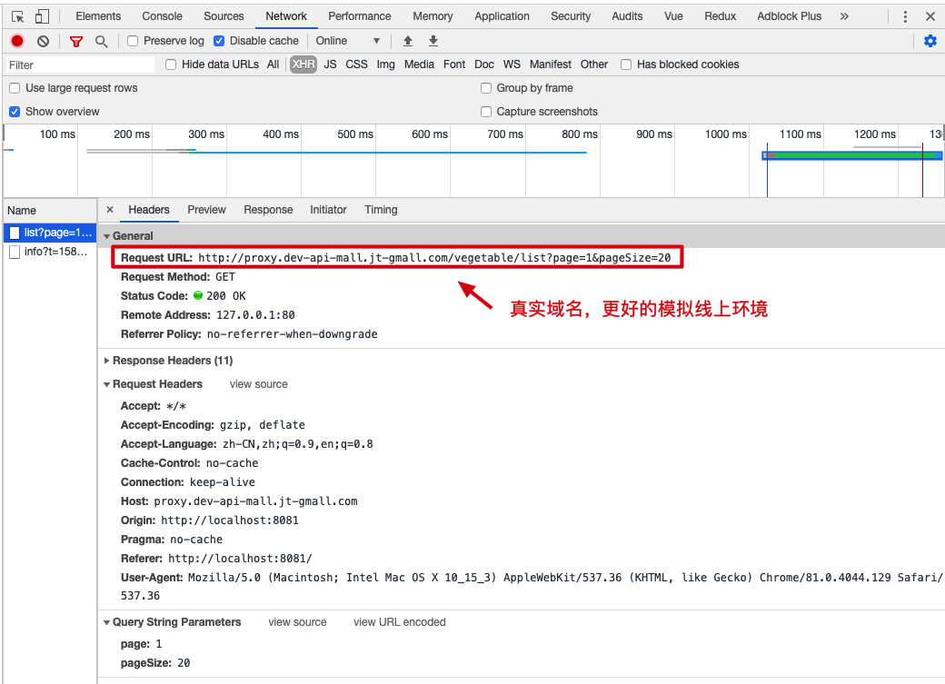 浏览器 - 客户端首先,我们在客户端(浏览器)发起了一个请求,请求的地址是 /vegetable/list?page=1&pageSize=20,浏览器首先解析出 hostname 的值为 proxy.dev-api-mall.jt-gmall.com。