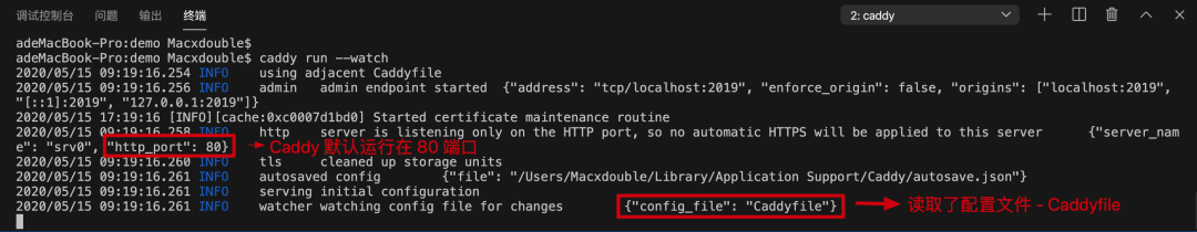 我们在命令行工具使用 caddy run --watch 命令运行 caddy(运行 caddy 时请保证 80 端口是空闲的),caddy 运行成功后将会输出下面的结果(见下图)