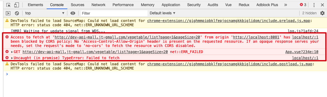 从上图可以看到,我们的请求失败了,请求失败的原因是因为浏览器的 同源策略 导致的跨域问题。